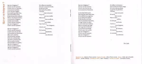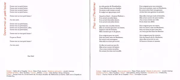 Backing Vocals [Deuxième Voix] Béatrice Morel-Journel | Bass [Basse] Cédric de la Chapelle | Drums [Batterie] Josselin Varengo | Electric Organ [Wurlitzer], Electric Organ [Farfisa] Denis Trouffleau | Guitar [Guitare 12-Cordes] Alexis Morel | Harpsichord [Clavecin], Strings [Cordes] Christophe Cravero
