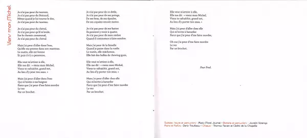 Choir [Chœurs] Cédric de la Chapelle, Thomas Fersen | Drums [Batterie], Percussion Josselin Varengo | Guitar [Guitares], Bass [Basse], Percussion Alexis Morel | Piano, Electric Organ [Farfisa] Denis Trouffleau