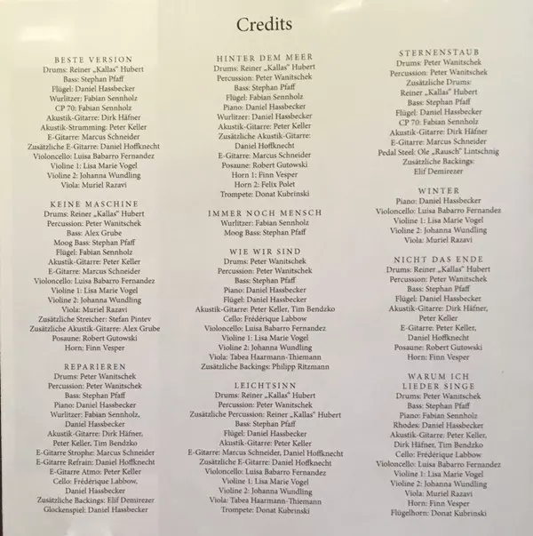 Acoustic Guitar Peter Keller | Acoustic Guitar [Additional], Bass Alex Grube | Bass [Moog] Stephan Pfaff | Co-producer, Recorded By [String & Bass] Philipp Schwär | Drums Reiner Hubert | Electric Guitar Marcus Schneider (2) | Grand Piano Fabian Sennholz | Horns Finn Vesper | Percussion Peter Wanitschek | Recorded By [Additional] Simon Beizai | Strings [Additional] Stefan Pintev | Trombone Robert Gutowski | Viola Muriel Razavi | Violin [1st] Lisa Marie Vogel | Violin [2nd] Johanna Wundling | Violoncello Luisa Marie Babarro Fernández