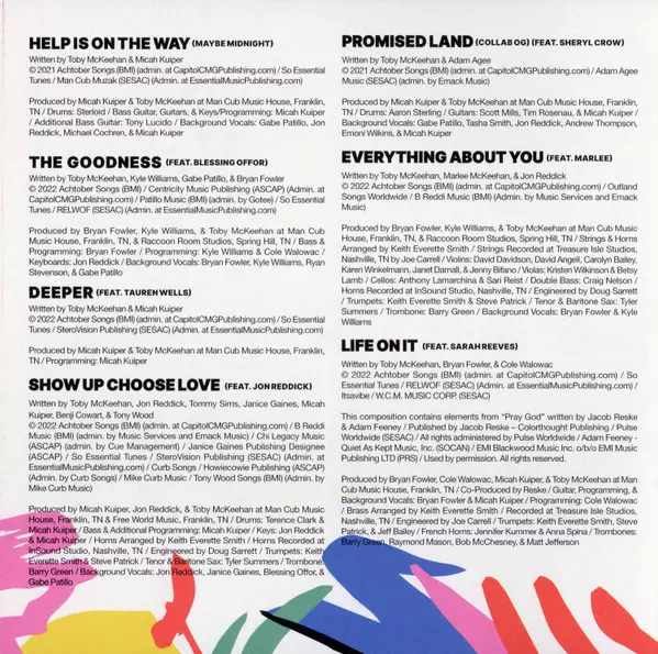 Arranged By [Brass] Keith Everette Smith | Backing Vocals Bryan Fowler, Micah Kuiper | Co-producer Reske | Engineer Joe Carrell | Featuring Sarah Reeves | French Horn Anna Spina (2), Jennifer Kummer | Guitar Bryan Fowler, Micah Kuiper | Mastered By Chris Gehringer | Mixed By Nick Rad | Producer Bryan Fowler, Cole Walowac, Micah Kuiper, Toby McKeehan | Programmed By Bryan Fowler, Cole Walowac, Micah Kuiper | Trombone Barry Green, Bob McChesney, Matt Jefferson (2), Ray Mason (3) | Trumpet Jeff Bailey, Keith Everette Smith, Steve Patrick (2) | Written-By Bryan Fowler, Cole Walowac, Toby McKeehan | Written-By [Elements from "Pray God"] Adam Feeney, Jacob Reske