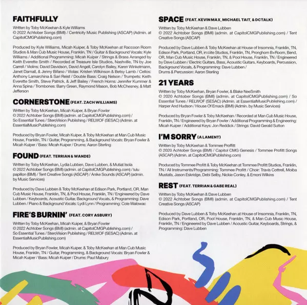Arranged By [Strings & Bass] Keith Everette Smith | Backing Vocals Kyle Williams (8) | Cello Anthony Lamarchina, Sarighani Reist | Double Bass Craig Nelson | French Horn Anna Spina (2), Jennifer Kummer | Guitar Kyle Williams (8) | Mastered By Chris Gehringer | Mixed By Nick Rad | Producer Kyle Williams (8), Micah Kuiper, Toby McKeehan | Programmed By [Additional] Micah Kuiper | Recorded By Joe Carrell | Trombone Barry Green, Bob McChesney, Matt Jefferson (2), Ray Mason (3) | Trumpet Jeff Bailey, Keith Everette Smith, Steve Patrick (2) | Viola Betsy Lamb, Kristin Wilkinson | Violin Carolyn Bailey, David Angell, David Davidson, Janet Darnall, Jenny Bifano, Karen Winkelmann | Written-By Kyle Williams (8), Toby McKeehan