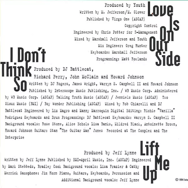 Backing Vocals Alice Sanderson, Antoinette Brown, Howard Johnson, Lisa Banks, Mildred Black, Rose Stone | Edited By [Digital Editing] Richie Rodriguez | Engineer Liz Magro, Manny Marroquin | Guitar Stan "The Guitar" Man | Keyboards Warryn Campbell | Keyboards, Drum Programming DJ Battlecat | Mixed By DJ Battlecat, Rob Chiarelli | Producer DJ Battlecat, Howard Johnson, John McClain, Richard Perry | Written-By D. J. Rogers, Howard Johnson, James Wright, Warryn Campbell