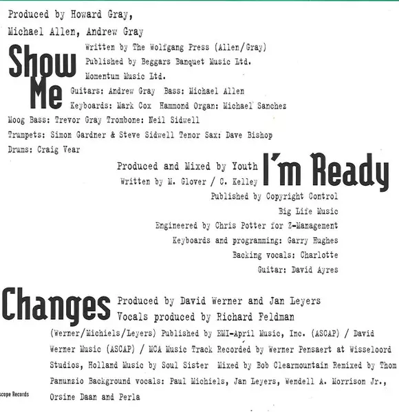 Bass Michael Allen | Drums Craig Vear | Guitar [Guitars] Andrew Gray | Keyboards Mark Cox | Organ [Hammond] Michel Sanchez | Producer Andrew Gray, Howard Gray, Michael Allen | Synthesizer [Moog Bass] Trevor Gray | Tenor Saxophone Dave Bishop | Trombone Neil Sidwell | Trumpet Simon Gardner, Steve Sidwell | Written-By Andrew Gray, Michael Allen, The Wolfgang Press