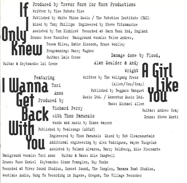 Backing Vocals Bruce Woolley, Helen Andrews, Katie Kissoon, Tessa Niles | Drums Owen Rossiter | Engineer Steve Fitzmaurice | Engineer [Assistant] Tom Elmhirst | Guitar Lalo Creme | Guitar, Keyboards Lol Creme | Mixed By Tony Phillips | Producer Trevor Horn | Programmed By [Programming] Garry Hughes | Written-By Rise Robots Rise