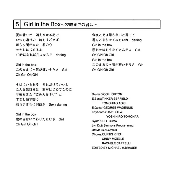 Chorus Cindy Mizelle, Curtis King, Rachele Cappelli | Drum Machine [Lyn Dr.], Programmed By [Simmons] Jimmy Bralower | Drums Yogi Horton | Edited By Michael H. Brauer | Electric Bass Tinker Barfield, Tomohito Aoki | Electric Guitar Georg Wadenius | Keyboards Ray Chew, Yoshihiro Tomonari | Synthesizer Jeff Bova