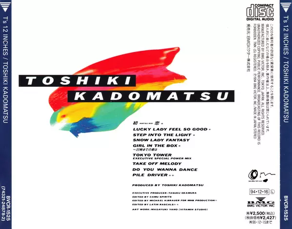 Toshiki Kadomatsu: T’s 12 Inches Die Version auf CD in Standard- Auflage. Diese besondere Auflage wurde veröffentlicht in Japan im Verlag Om (4) In Zusammenarbeit mit BMG Victor Inc. am 16. Dezember 1994. Album Genres übergreifend Pop, Elektronische Musik, Funk / Soul, Hip Hop, Soul, Funk, Disco, Boogie und City Pop.