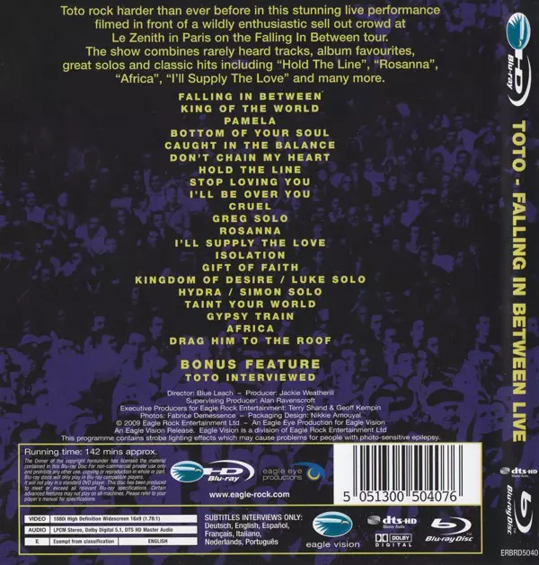 The 2007 album Falling In Between Live is a live album by the band Toto.The album was recorded in 2007 and released in 2008. The album is a live recording of the band's performance at Budokan in Tokyo, Japan on 25 March 2007. The album was produced by Toto and mixed by Elliot Scheiner. The album was released on CD and DVD. The album was commerci...