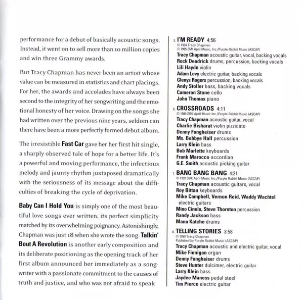 Bass Larry Klein | Drums Denny Fongheiser | Electric Guitar, Organ [Hammond] Jack Holder | Electric Guitar, Vocals Tracy Chapman | Keyboards Steve Kaplan | Percussion Paulinho Da Costa