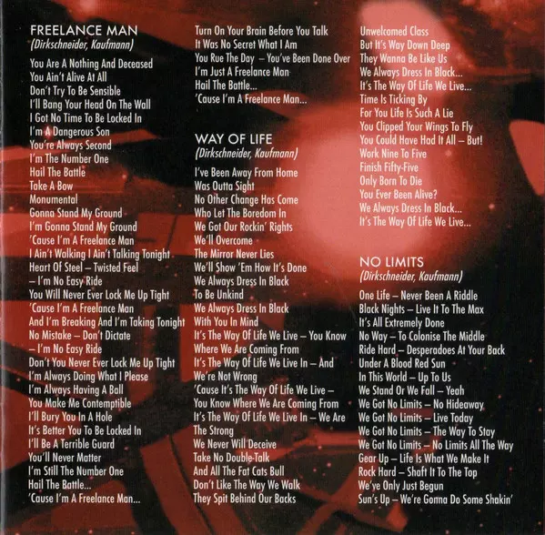 "No Limits" ist das sechste Studioalbum der Metal-Band um Udo Dirkschneider. Es ist das letzte Album, auf dem Gitarrist Jürgen Graf zu hören ist. Rezensionen "Bereits das letztjährige Comeback-Album "Solid" war nicht von schlechten Eltern (sonst hätte es sich wohl kaum über ein Jahr in unseren Lesercharts gehalten), doch "No Limits" bringt das K...