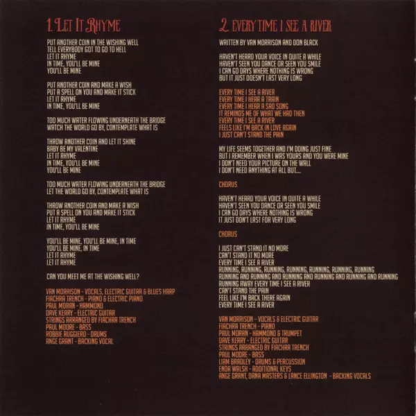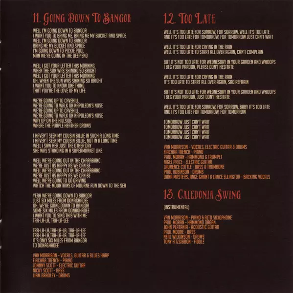 Backing Vocals Dana Masters | Bass Nicky Scott | Drums Liam Bradley | Electric Guitar Johnny Scott (3) | Keyboards [Additional Keys], Percussion Enda Walsh | Piano, Electric Organ [Hammond Organ] Fiachra Trench | Vocals, Electric Guitar, Blues Harp Van Morrison