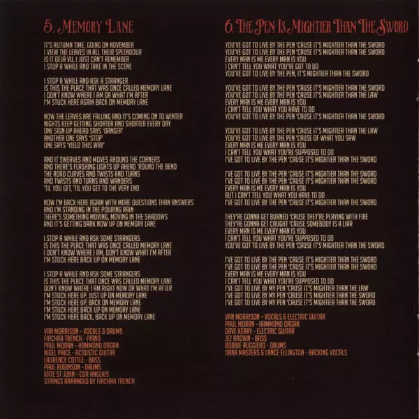 Acoustic Guitar Dave Keary | Bass Jeremy Brown | Drums Robbie Ruggiero | Piano, Trumpet Paul Moran (5) | Vocals Van Morrison