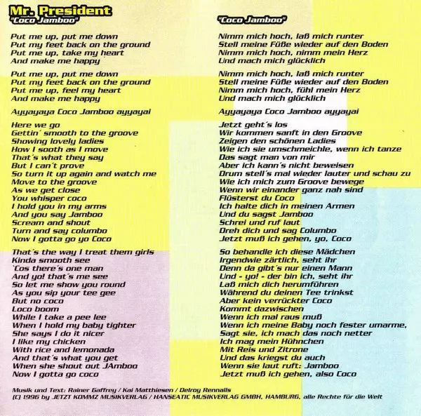 | 1-1 | Mr President: Coco Jamboo (Radio Version) | 3:37 min | |