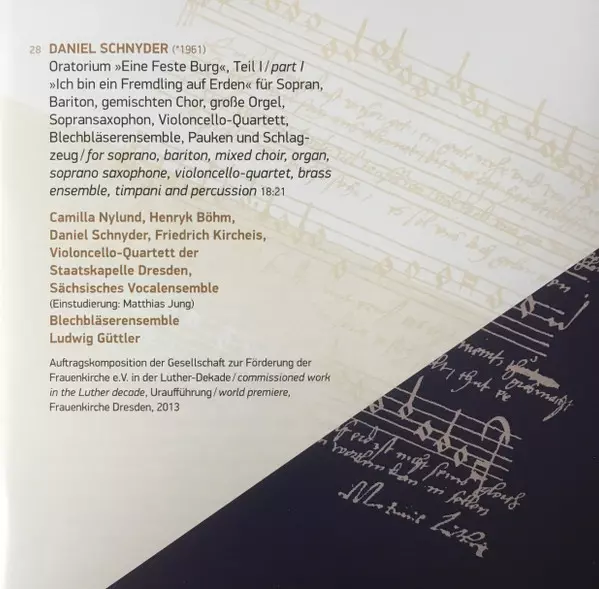 28 | Sächsisches Vocalensemble, Camilla Nylund, Daniel Schnyder, Henryk Böhm, Blechbläservereinigung Ludwig Güttler, Friedrich Kircheis, Violoncello-Quartett Der Staatskapelle Dresden: Oratorium "Eine Feste Burg", Teil I / "Ich Bin Ein Fremdling Auf Erden" Für Sopran, Bariton, Gemischten Chor, Große Orgel, Sopra | 18:21 min | |