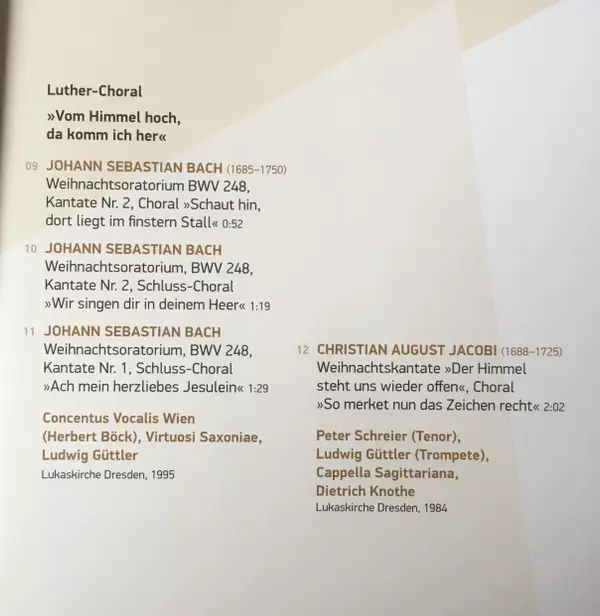 12 | Peter Schreier, Ludwig Güttler, Cappella Sagittariana Dresden, Dietrich Knothe: Weihnachtskantate "Der Himmel Steht Uns Wieder Offen", Choral "So Merket Nun Das Zeichen Recht" | 2:02 min | |