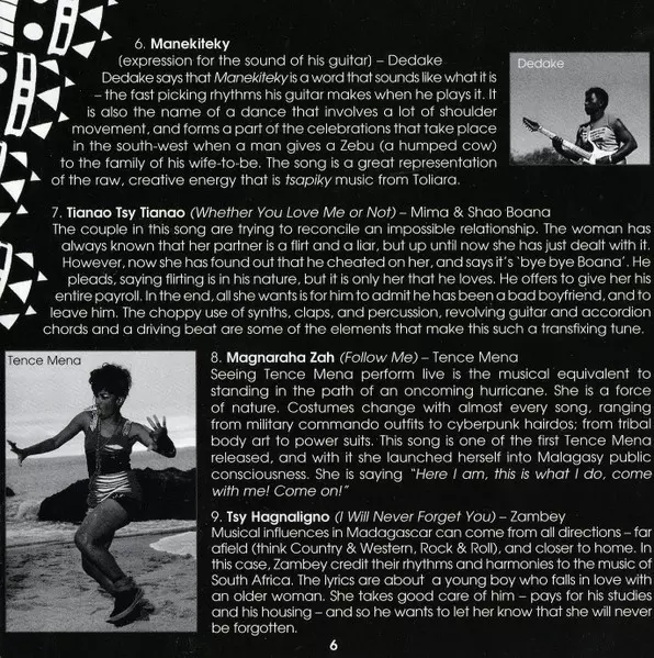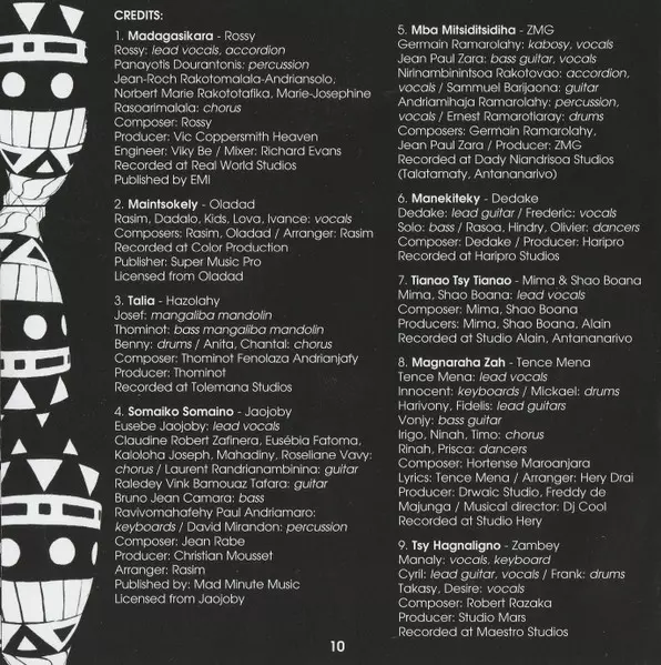 | Accordion Rossy | Backing Vocals Jean-Roch Rakotomalala-Andrianasolo, Marie-Josephine Rasoarimalala, Norbert-Marie Rakototafika | Engineer Viky Be | Lead Vocals Rossy | Mixed By Richard Evans (3) | Percussion Panayotis Dourantonis | Producer Vic Coppersmith-Heaven | Written-By Rossy | |||