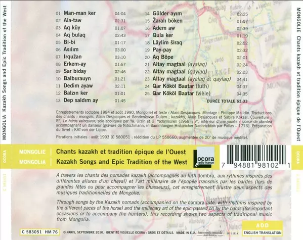 Various: Mongolie - Chants Kazakh Et Tradition Épique De L'Ouest = Mongolia - Kazakh Songs And Epic Tradition Of The West Die Version auf CD in Standard- Auflage. Diese besondere Auflage wurde veröffentlicht in Frankreich im Verlag Ocora am 1. Juli 2018. Album Genres übergreifend Folk, World, & Country, Folk, Field Recording und Overtone Singing.