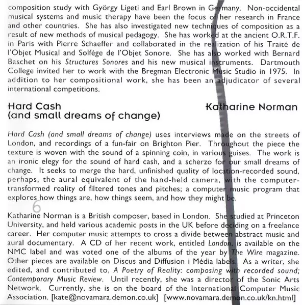 | Electronics [Kyma Digital Signal Processing System] Lawrence Fritts | Voice Chris Mann | |||