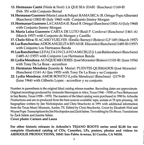 | Accompanied By Gilberto Lopez Y Su Conjunto | Accordion Gilberto López (3) | Written-By Lydia Mendoza | |||