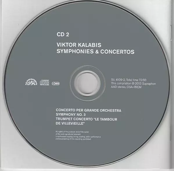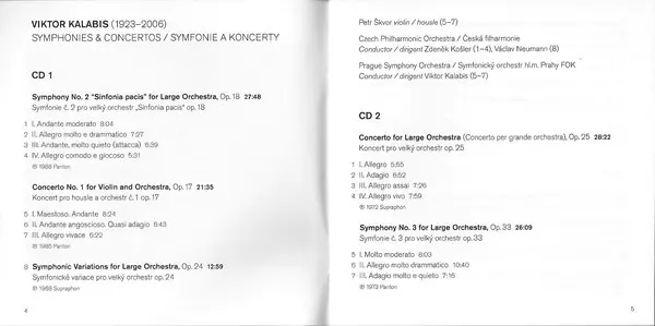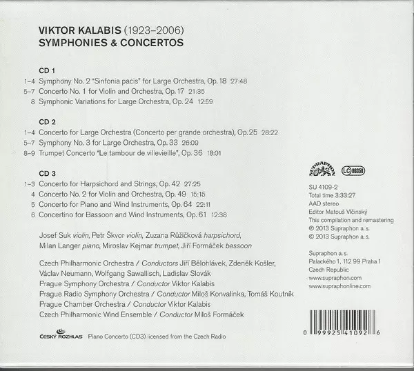 Viktor Kalabis: Symphonies & Concertos Die Version auf 3CD in Standard- Auflage. Diese besondere Auflage wurde veröffentlicht in Europa im Verlag Supraphon am 26. April 2013. Album Genres übergreifend Klassische Musik, Modernism und Tschechoslowakische Klassiker.