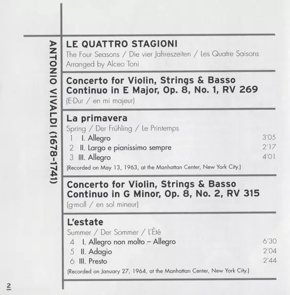 | Titel | The Four Seasons (Le Quattro Stagioni) / Concerto For Diverse Instruments / Oboe Concerto / Flute Concerto |