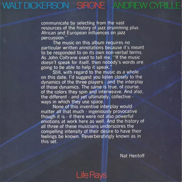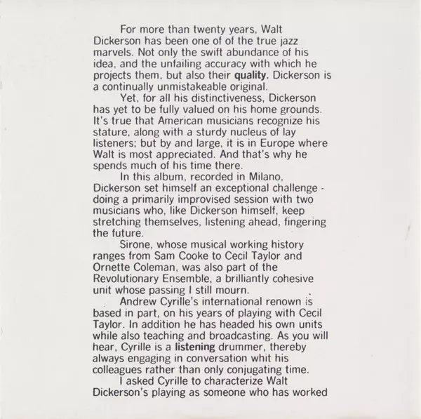 | Künstler | Andrew Cyrille | Walt Dickerson | Sirone |