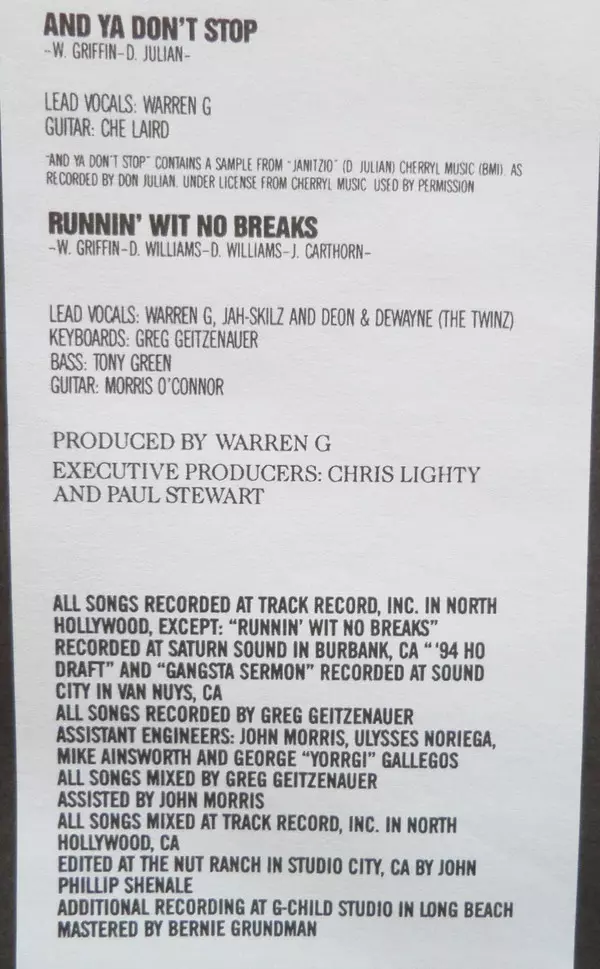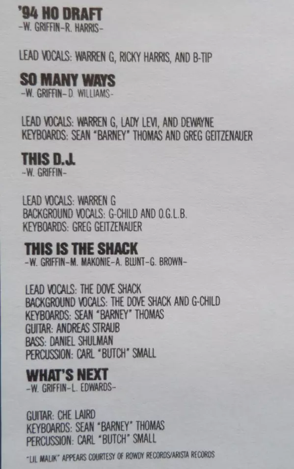 Backing Vocals [Background Vocals] G-Child, O.G.L.B. | Keyboards Greg Geitzenauer | Lead Vocals Warren G | Written-By Warren Griffin III