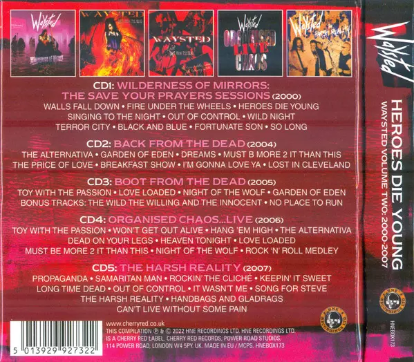 Waysted: Heroes Die Young (Waysted Volume Two: 2000-2007) Die Version auf 5CD/Box Set in Standard- Auflage. Diese besondere Auflage wurde veröffentlicht in UK im Verlag HNE Recordings Ltd am 18. November 2022. Album Genres übergreifend Rock, Hard Rock und Heavy Metal. 2000 2007.