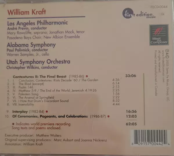 | Künstler | André Previn | Los Angeles Philharmonic Orchestra | Utah Symphony Orchestra | William Kraft | Paul Polivnick | Alabama Symphony Orchestra | Mary Rawcliffe | Jonathan Mack | Pasadena Boys Choir | New Albion Ensemble | Warren Samples, Jr. | Christopher Wilkins |