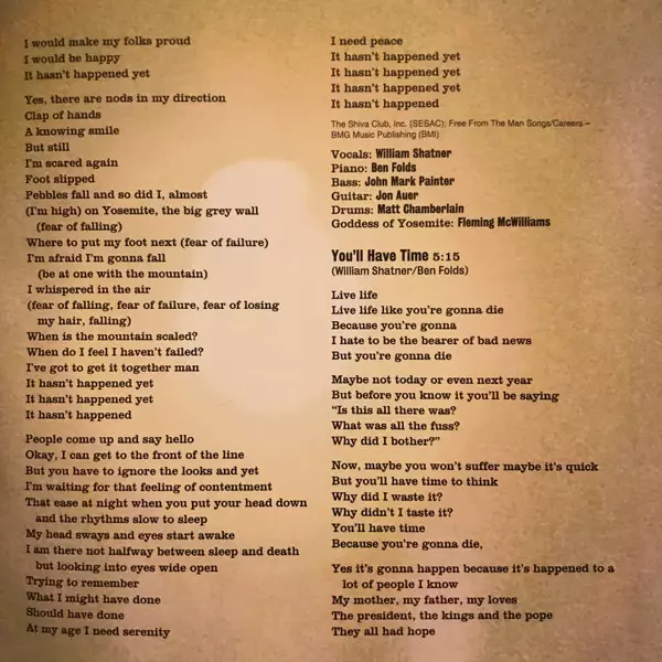 Choir Benita Hill, Curt Bol, Laurie Wheeler, Rick Wheeler | Double Bass Sebastian Steinberg | Drums Matt Chamberlain | Electric Guitar Jon Auer | Guitar John Mark Painter | Piano Ben Folds | Written-By Ben Folds, William Shatner