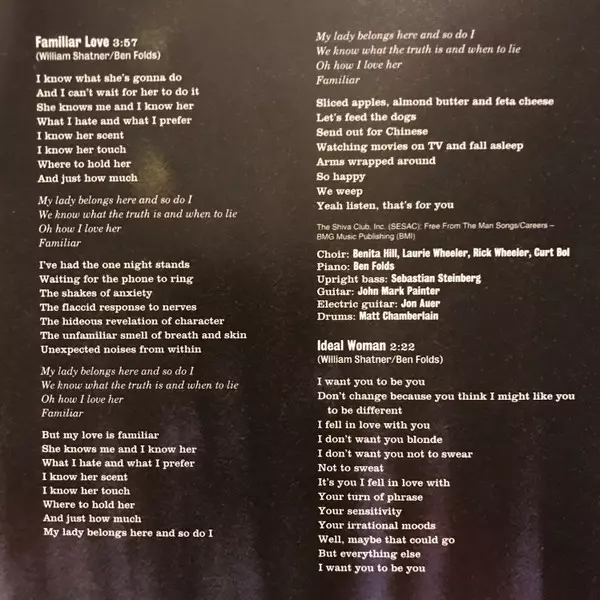 Bass John Mark Painter | Drums Matt Chamberlain | Guitar Jon Auer | Piano Ben Folds | Written-By Ben Folds, William Shatner