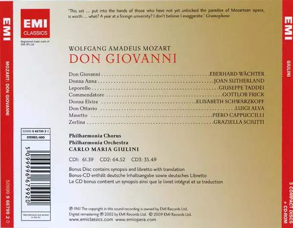 | Künstler | Wolfgang Amadeus Mozart | Philharmonia Orchestra | Carlo Maria Giulini | Joan Sutherland | Piero Cappuccilli | Elisabeth Schwarzkopf | Philharmonia Chorus | Gottlob Frick | Eberhard Wächter | Luigi Alva | Giuseppe Taddei | Graziella Sciutti |