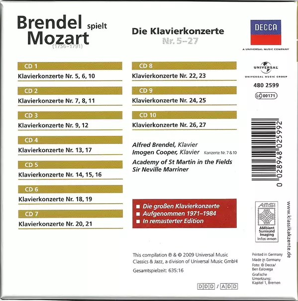 Wolfgang Amadeus Mozart: Brendel Spielt Mozart - Die Klavierkonzerte Nr. 5-27 Die Version auf 10CD in remastered Auflage. Diese besondere Auflage wurde veröffentlicht in Deutschland im Verlag Decca am 7. August 2009. Album Genres übergreifend Klassische Musik und Romantik.