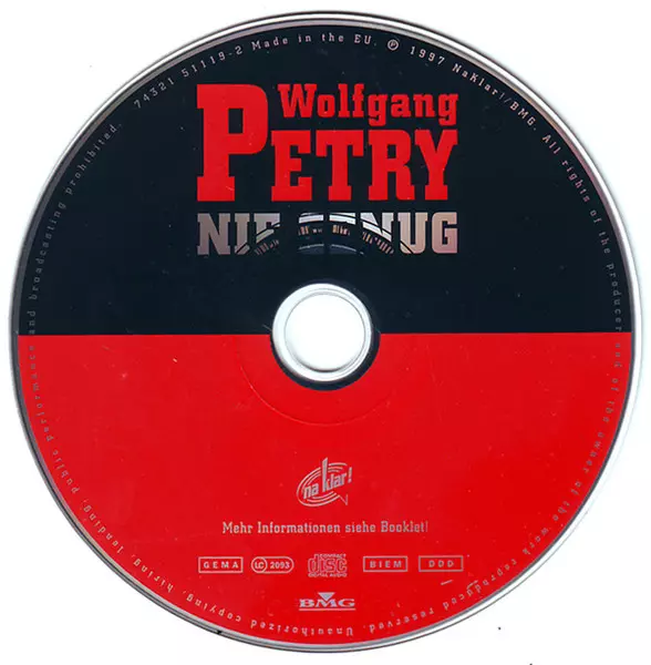 Wolfgang Petry: Nie Genug Die Version auf CD in Standard- Auflage. Diese besondere Auflage wurde veröffentlicht in Europa im Verlag Na Klar! am 22. August 1997. Album Genres übergreifend Rock, Pop, Elektronische Musik, Schlager, Pop Rock, AOR und Europop.