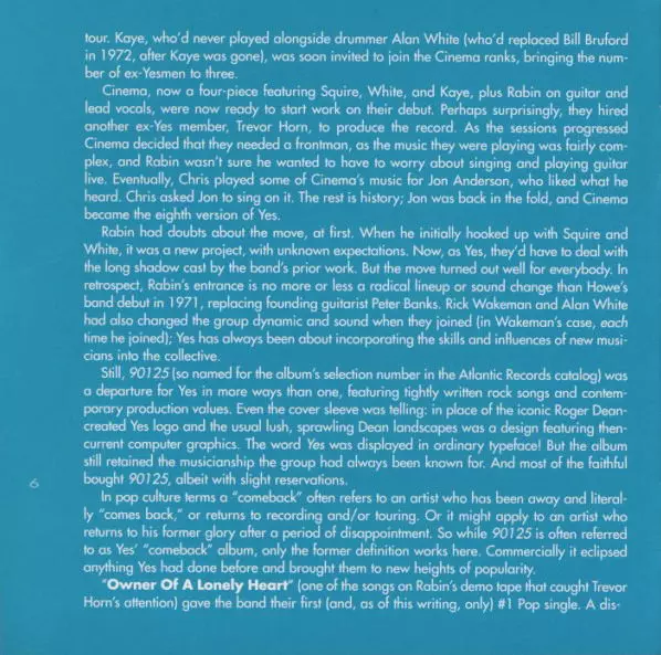 90125 is an album by the progressive rock band Yes , released in 1983. It is their eleventh studio album and the first to feature Trevor Rabin on guitar and vocals. The album was a commercial success, reaching number one in the United States and selling over five million copies. It spawned the singles "Owner of a Lonely Heart", "Leave It" and "I...