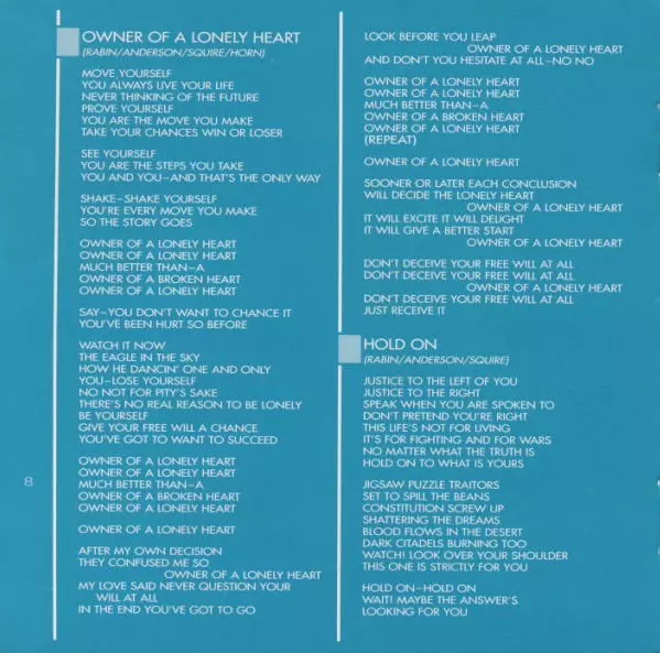 | 1 | Yes: Owner Of A Lonely Heart | 4:30 min | |