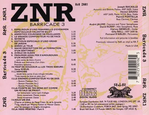 A Marseille based left-field experimental group formed in the mid 1970's. ZNR originally stood for Zazou - Néneux - Racaille, key members of the pioneering underground band Barricade augmented by a floating roster of other talent of the left-field, folk and jazz scenes. ZNR made tw...