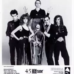 During 1979-1990 in Los Angeles, the band was born in the chaos of the Punk movement and churned out their own brand of Ghoul Rock that later was labeled the Deathrock / Gothic genre. In the beginning, the original lineup consisted of Dinah Cancer - vocals Paul Cutler - guitar Rob Graves - bass Don Bolles - drums. The song "Partytime (Zombie Version)" made it onto the movie sound track for RETURN OF THE LIVING DEAD. Partytime made full rotation on MTV (1984) and the song "Evil", debut on MTV's The Cutting Edge in 1985. 45 Grave are cited in several rock music biographies to being a huge influence on many of the bands that surfaced from the L.A. scene. Their hit song Partytime is still licensed for tv and radio ads today. The bands momentum took a hit in 1991, when bassist Rob Graves passed away from an accidental overdose. The other members went their separate ways, pursuing their own musical projects. Actually the band is back, lead by the original cemetery girl herself, Dinah Cancer, on vocals. The line-up as of 2014 is Dinah Cancer (vocals), Dylan Thomas (guitar), Brandden Blackwell (bass), and Tom Coyne (drums).